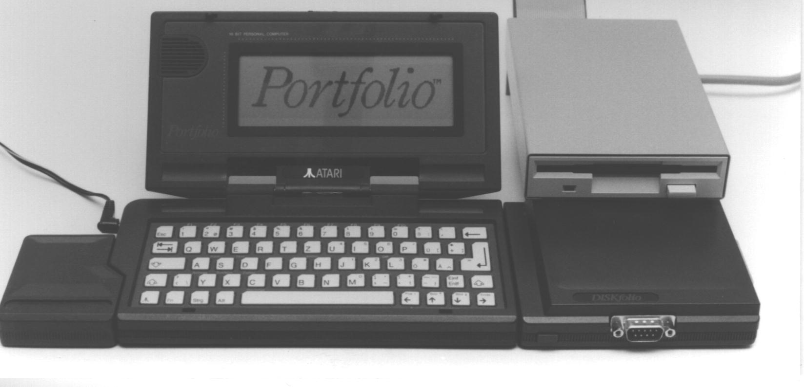 - Portfolio mit angestecktem Diskfolio und ATARI-ST-Diskettenlaufwerk