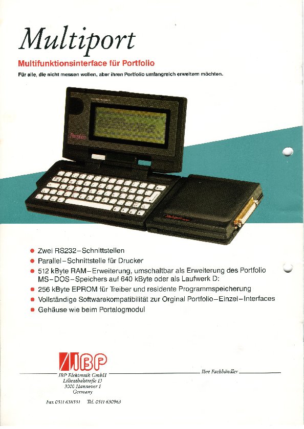 - Kurzbeschreibung des MultiPort, der Schnittstelle von IBP mit der einem Portfolio neben einer parallelen Schnittstelle auch noch zwei serielle Schnittstellen zur Verfügung gestellt wurden. Die Erkennung der zweiten seriellen Schnittstelle erfolgt über einen speziellen Treiber, der in einem EPROM im Schnittstellengehäuse enthalten ist.